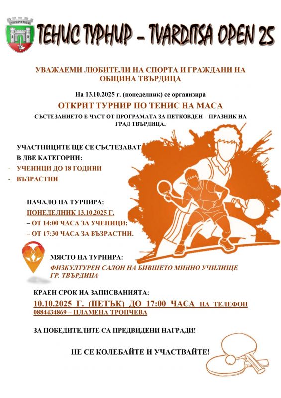 В рамките на празничната седмица на град Твърдица ще се проведе открит турнир по тенис на маса „Tvarditsa Open 25“. Спортното събитие ще се състои на 13 октомври 2025 г. (понеделник) в физкултурния салон на бившето Минно училище.