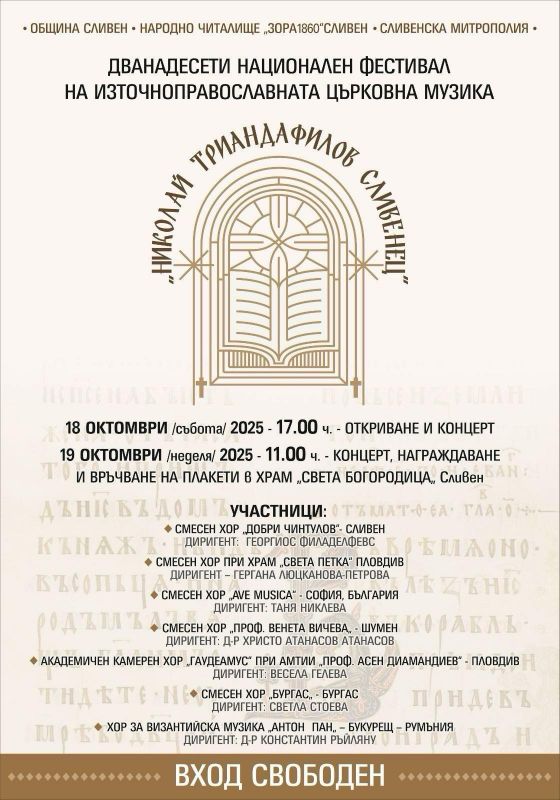 Сливен отново ще се превърне в духовен център на православното певческо изкуство. На 18 и 19 октомври 2025 г. градът ще бъде домакин на дванадесетото издание на Националния фестивал на източноправославната църковна музика „Николай Триандафилов Сливенец“.