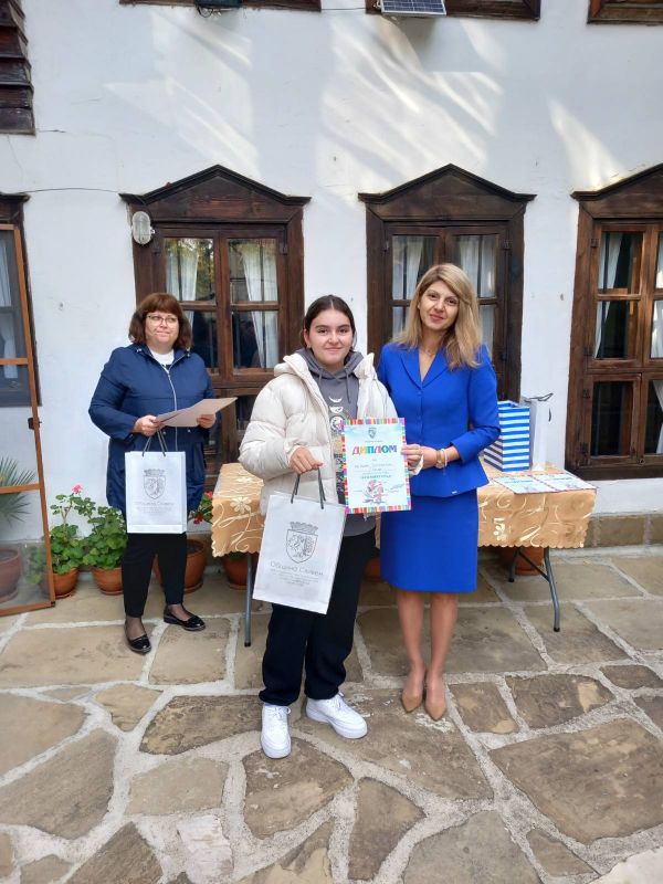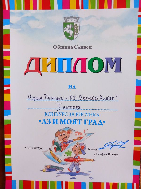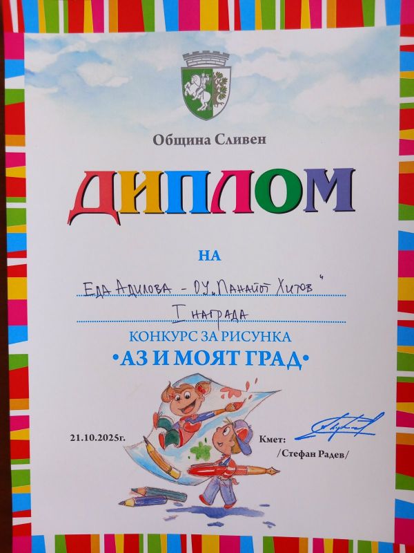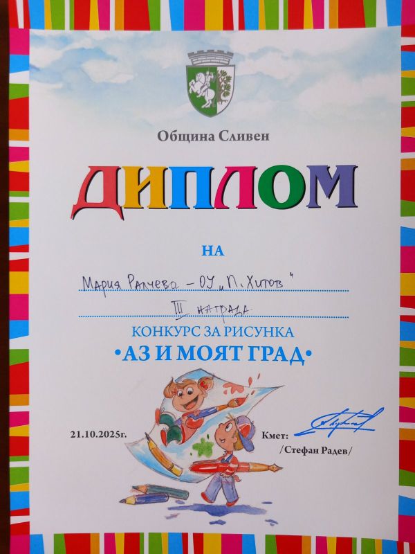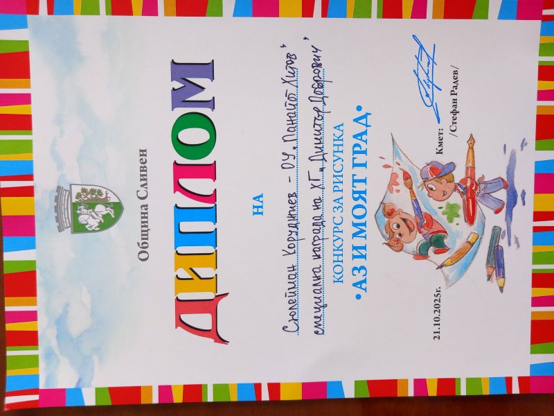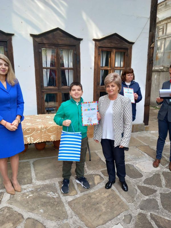 В навечерието на Димитровден, нашите талантливи деца заеха едно от водещите места сред всички училища от Сливен в конкурса за рисунка „Аз и моят град“. На официална церемония в двора на възрожденската галерия- Къща „Миркович“, грамоти и награди им бяха връчени от г-жа Пепа Чиликова, заместник- кмет на община Сливен, и г-жа Маргарита Пенева , директор на ХГ „Димитър Добрович“ !