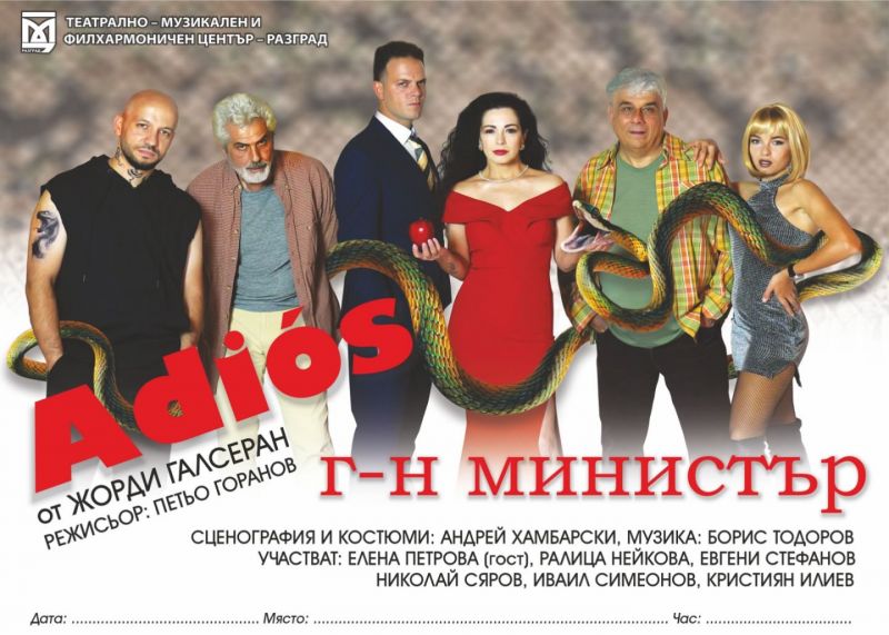 На 5 ноември от 19:00 ч., в обновената зала на НЧ „Зора“ – Сливен, ще се играе една от най-забавните театрални премиери на сезона – „Adios, Господин министър“, политическа комедия, която ще ви накара да се смеете, да се замислите и да видите колко близо до реалността може да бъде сцената.