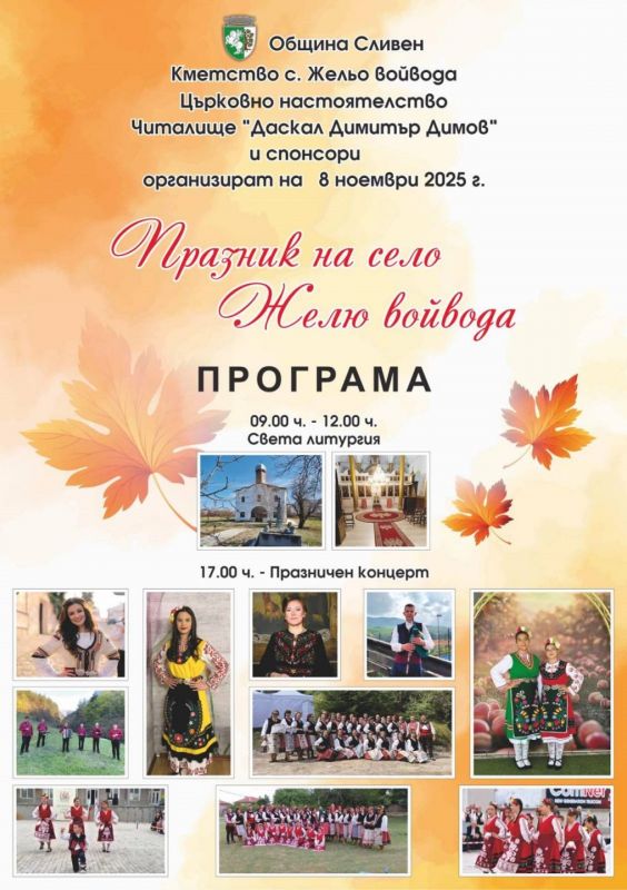 Сливенското село Желю войвода ще отбележи храмовия си празник на 8 ноември – събота, когато се чества Архангеловден. В Църквата “Св. Архангел Михаил” от 9 часа ще започне празнична Света литургия. Курбан за здраве и берекет ще бъде организиран от 12,30 часа в двора на църквата. От 17 часа на площада пред кметството ще се проведе концерт с участието на народните певици Галя Гильова и Михаела Костуркова, оркестър „Елхово“, местните изпълнители Никол Атанасова, Неделин Желев, Нелия и Петя Иванови, както и самодейни състави от Желю войвода.