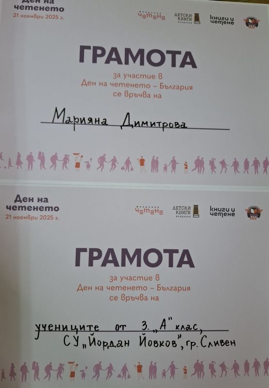 За своето участие учениците от 3. А клас и техният гост получиха грамота, която да им напомня за вдъхновяващия ден и да ги окуражава да продължават да откриват нови светове в книгите.