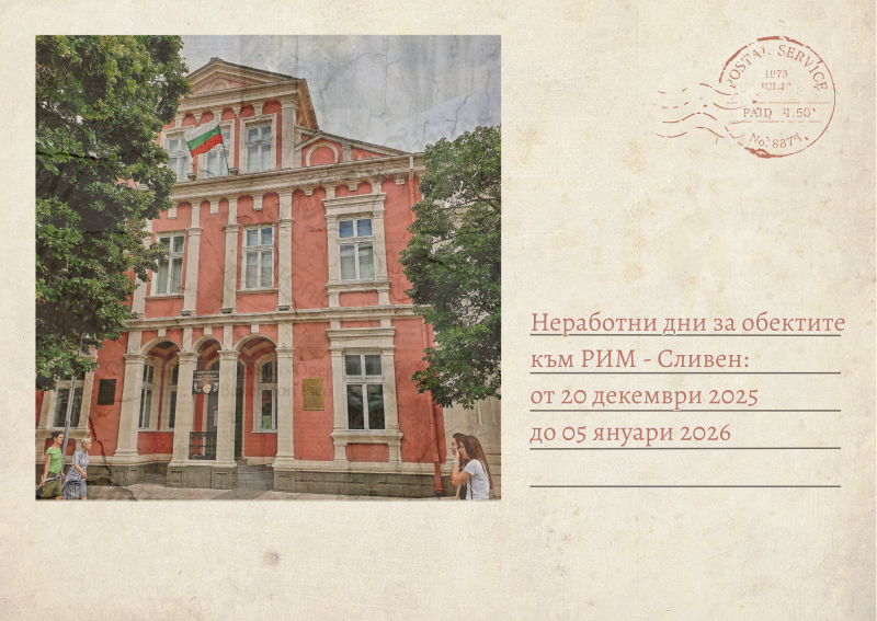 Уведомяваме Ви, че поради провеждането на инвентаризация и въвеждането на единната европейска валута в България, всички музейни обекти към Регионален исторически музей "Д-р Симеон Табаков" - Сливен няма да работят в периода 20 декември 2025 г. до 5 януари 2026 г.