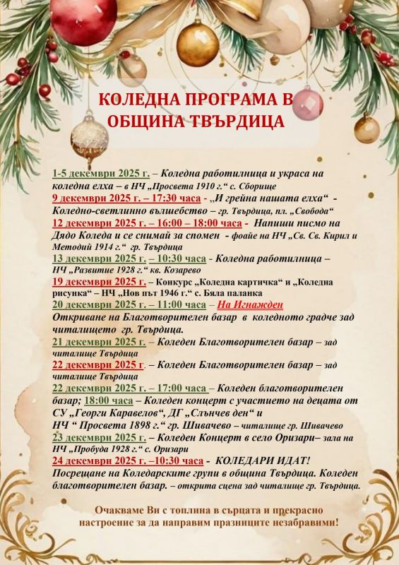 Община Твърдица кани всички жители и гости да станат част от празничните събития и заедно да посрещнат Коледа 2025 с надежда, благодарност и топлина.