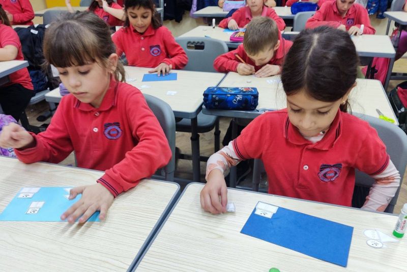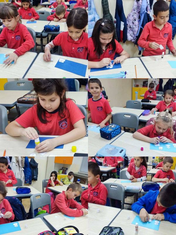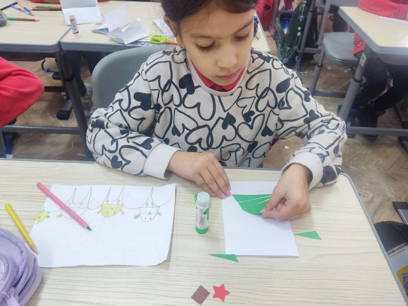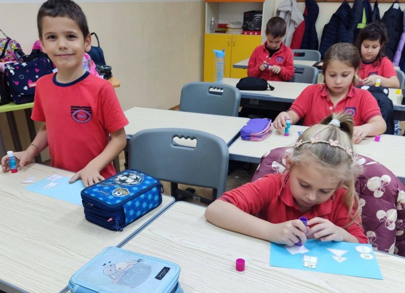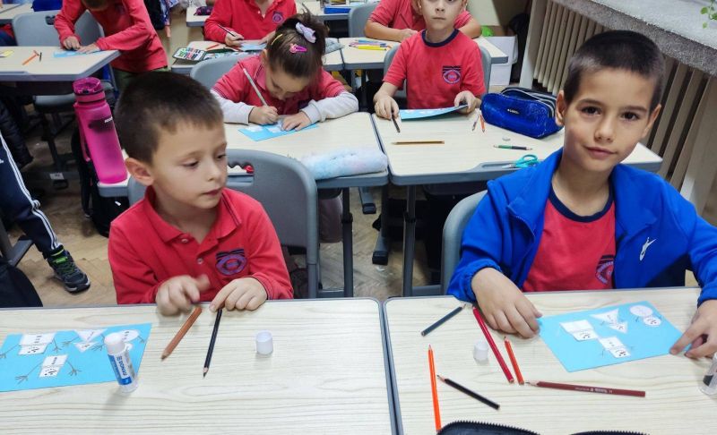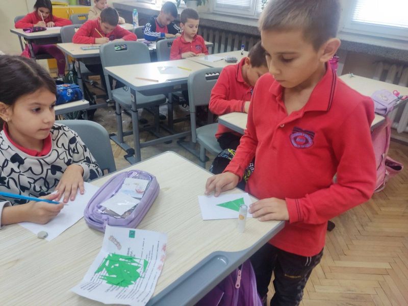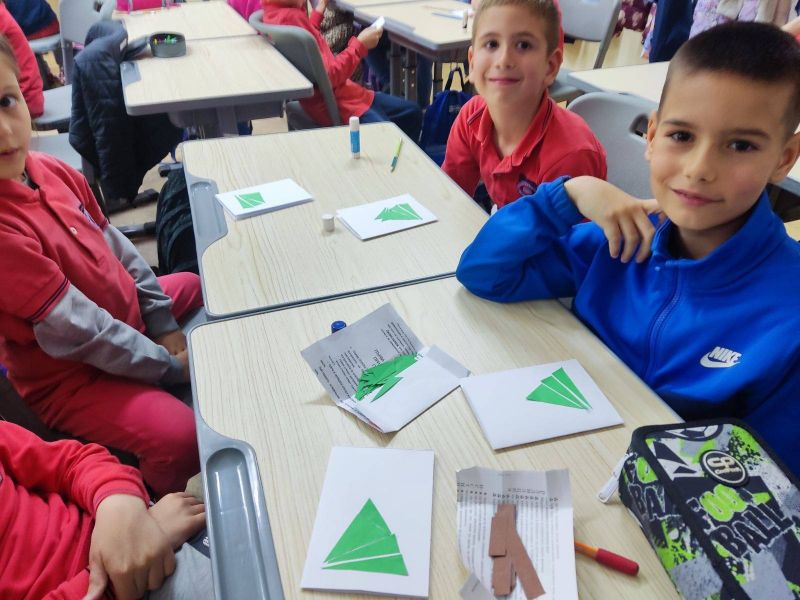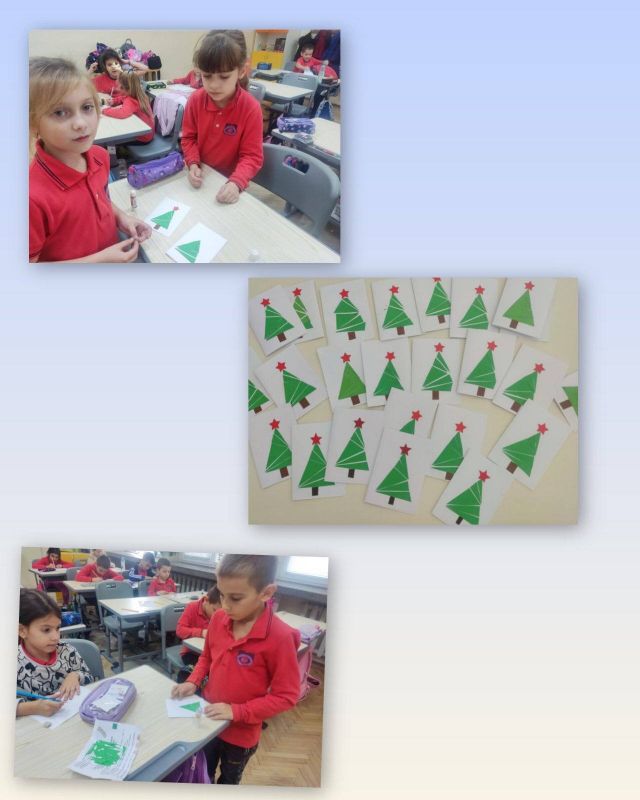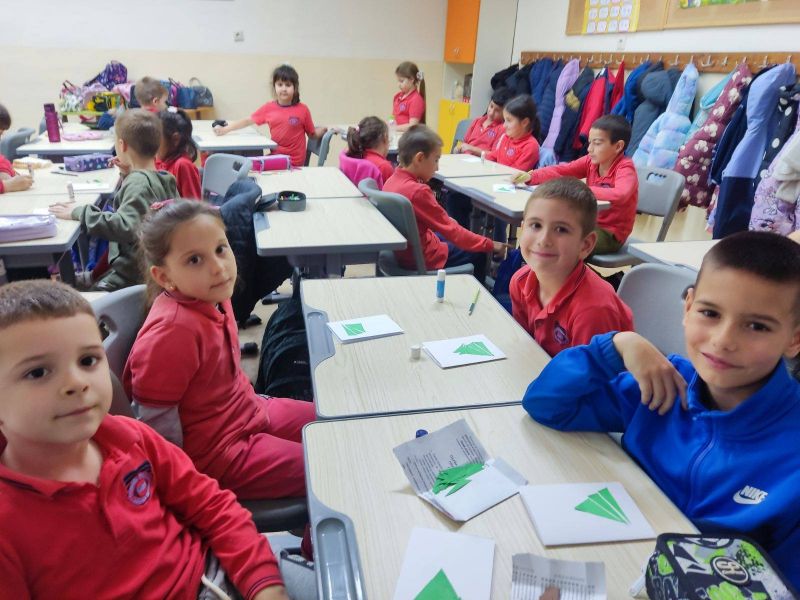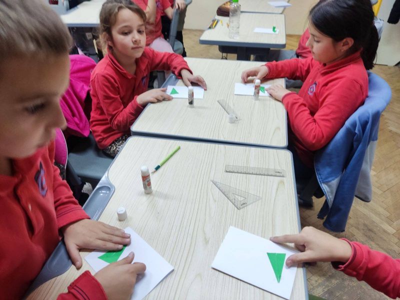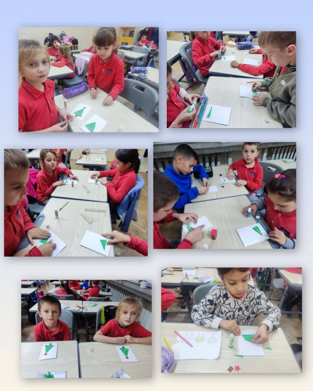 Учениците от I „А“ клас от групата за занимания по интереси "С ум, сърце и ръце в математиката“ приложиха знанията си за геометричните фигури и създадоха коледна елха, апликирана изцяло от триъгълници. На върха ѝ блесна и ярка коледна звезда!