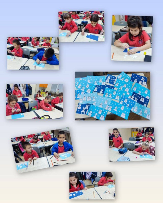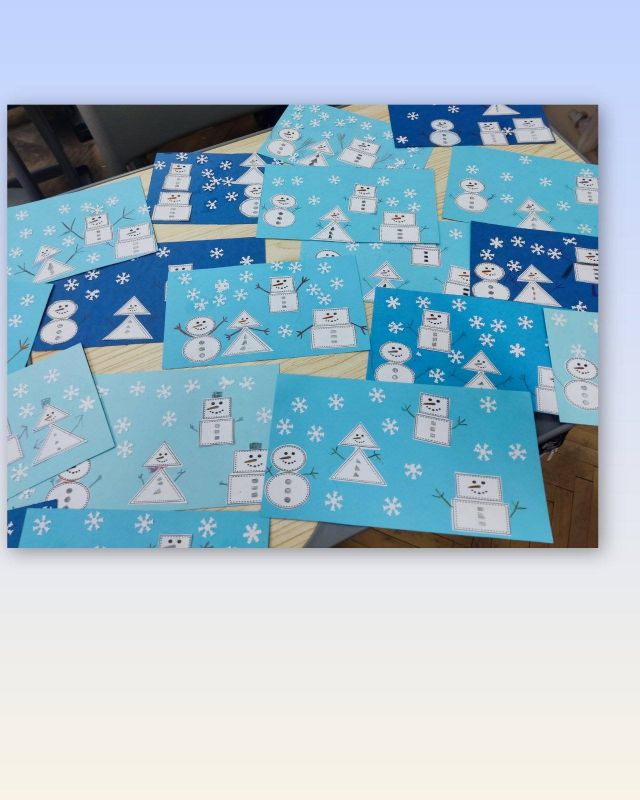 Съобразителните първокласници изработиха и красив зимен пейзаж, в който оживяха весели снежни човечета, съставени от триъгълник, правоъгълник, квадрат и кръг.