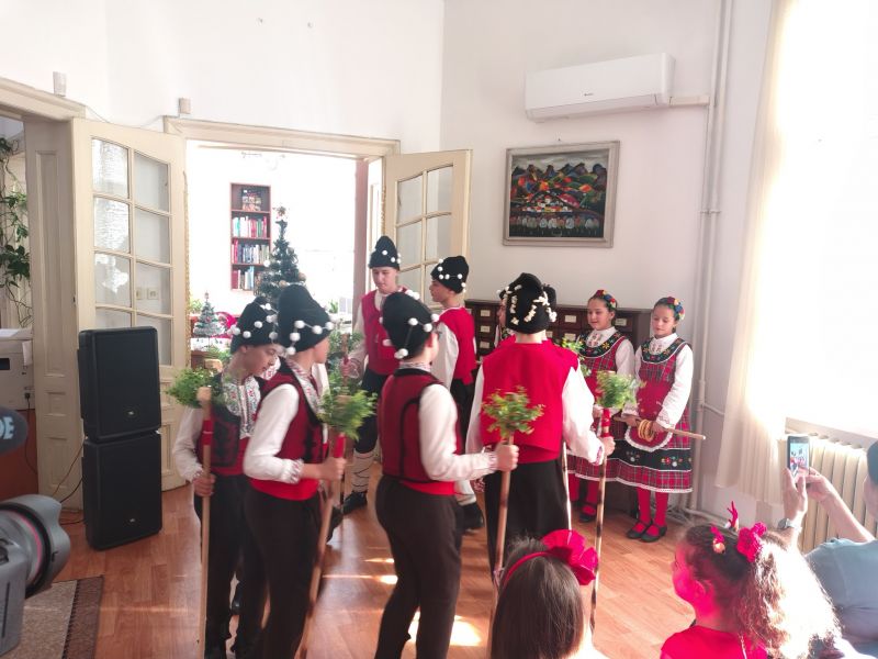 По-късно учениците от ОУ „Елисавета Багряна“ се включиха в тържествената програма по награждаването на отличените участници в конкурса за коледна картичка, организиран от Регионална библиотека „Сава Доброплодни“. Там фолклорът отново намери своя глас – чист, детски и искрен.