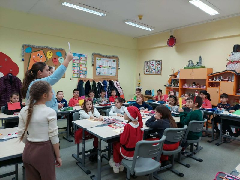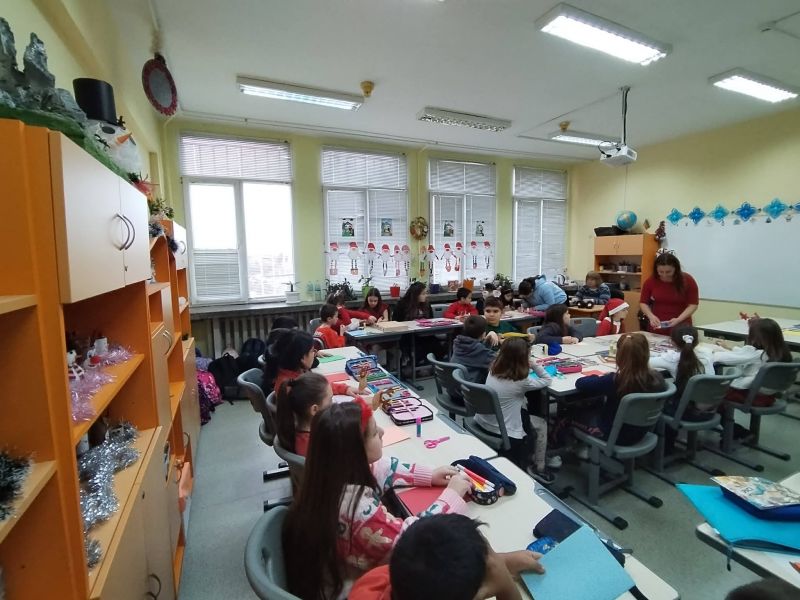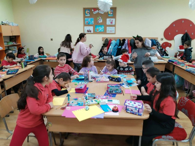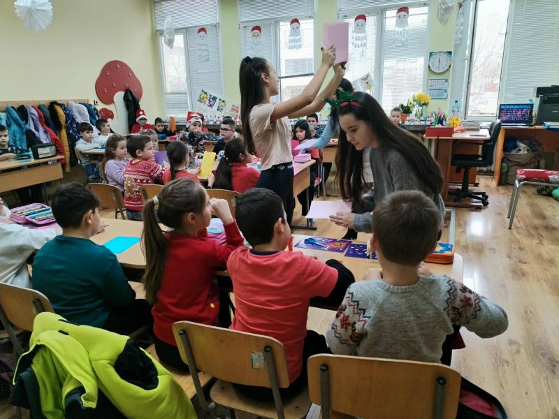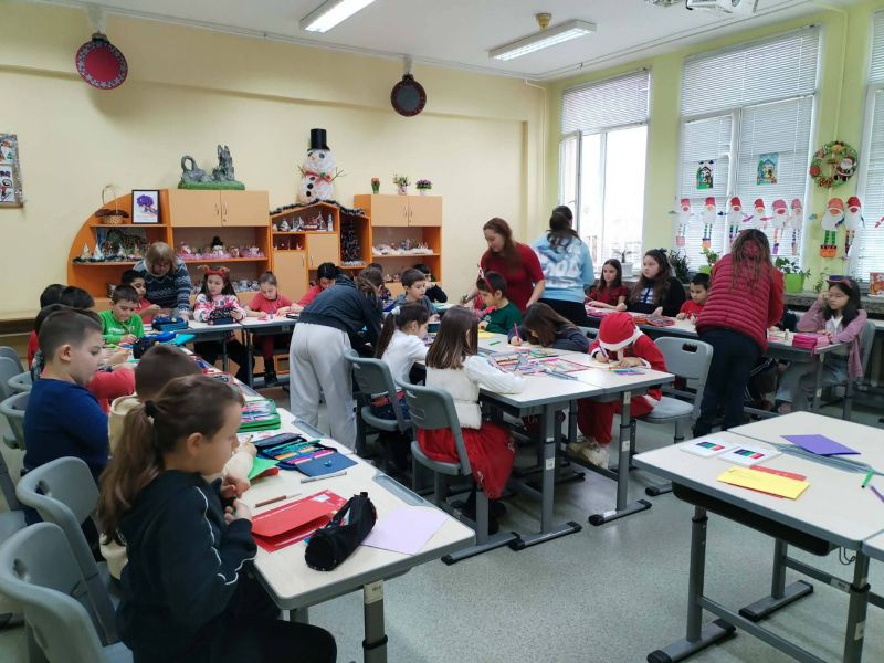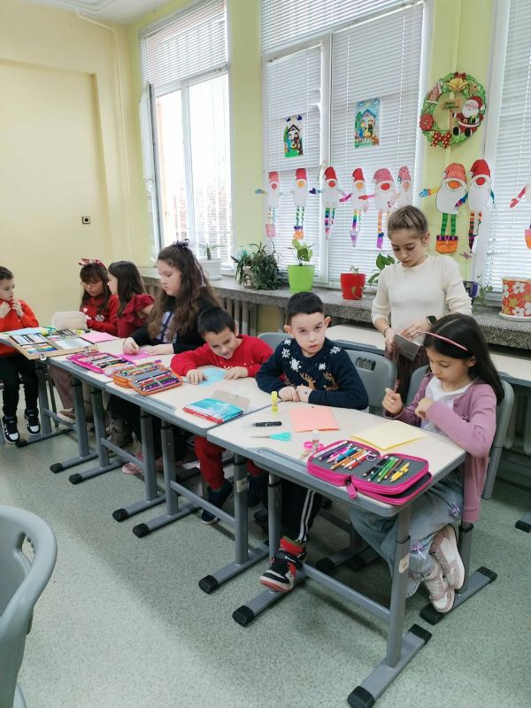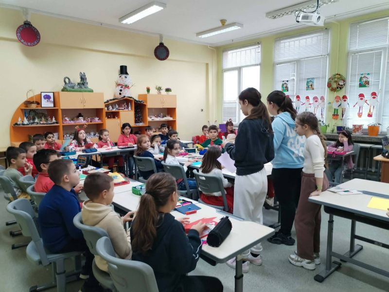 По идея на Ученическия съвет училището ни се превърна в истинска коледна работилница, в която големите ученици подадоха ръка на по-малките. В съвместна инициатива ученици от шести клас и второкласниците от 2. "а", 2. "в" и 2. "г" създадоха празник, пълен с усмивки, цвят и смисъл.