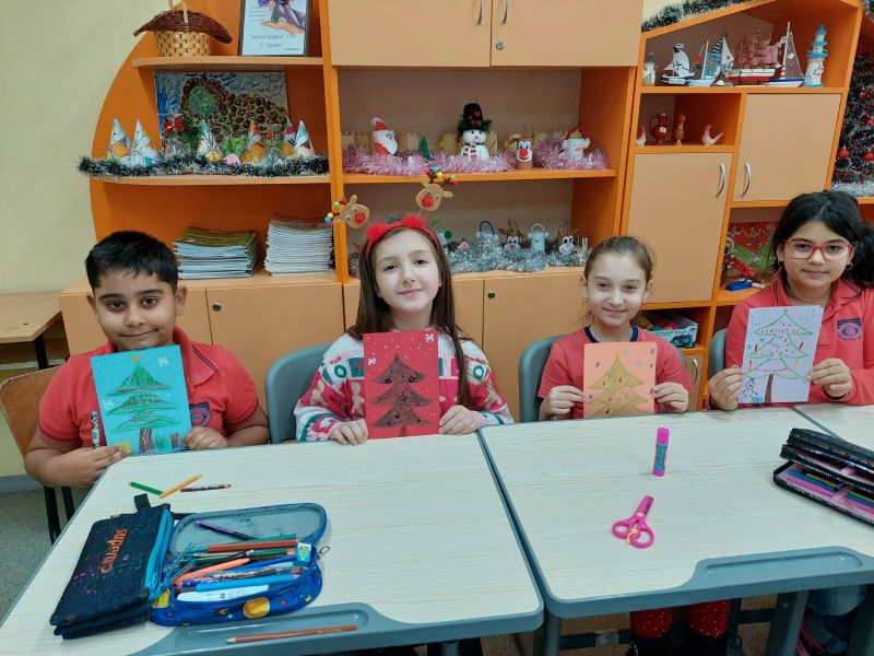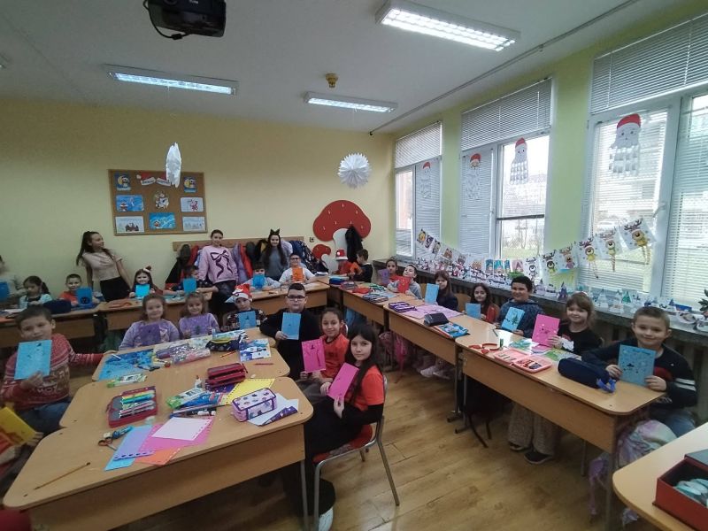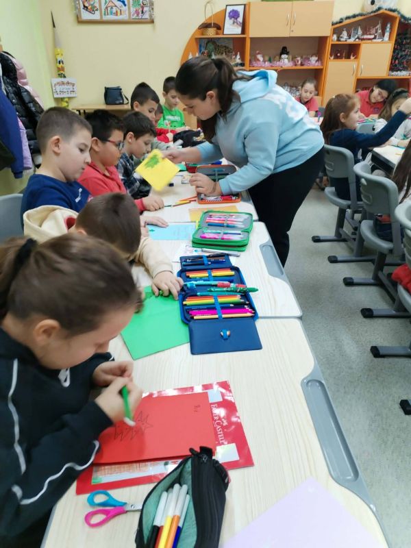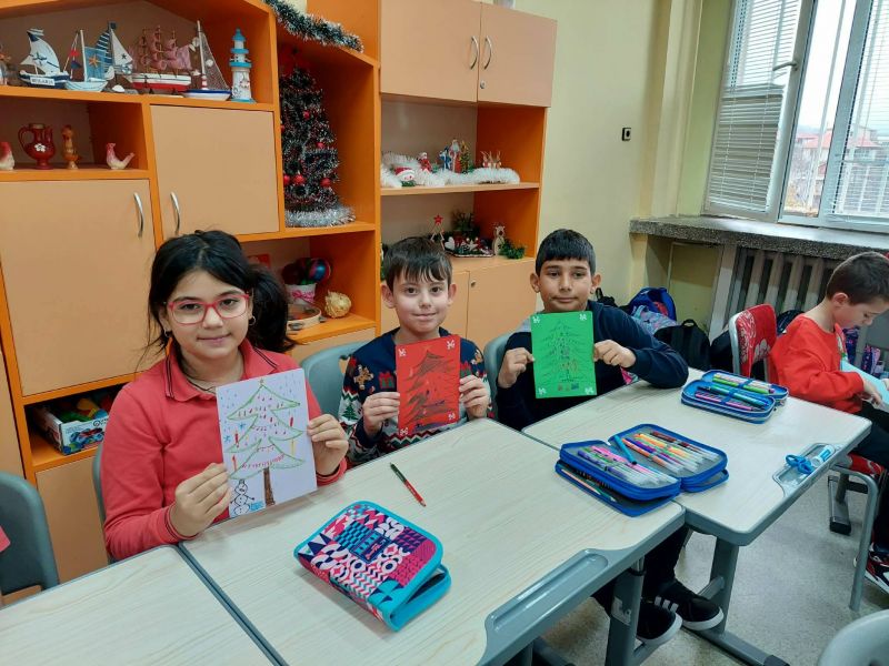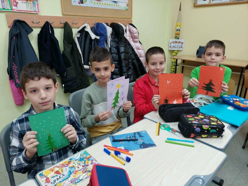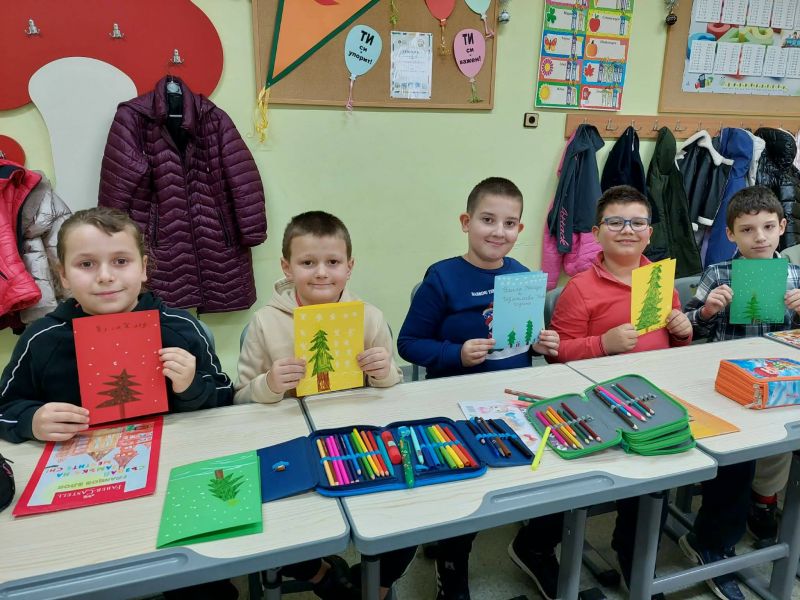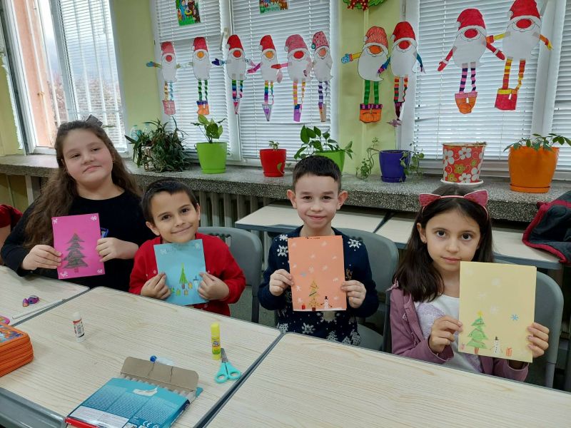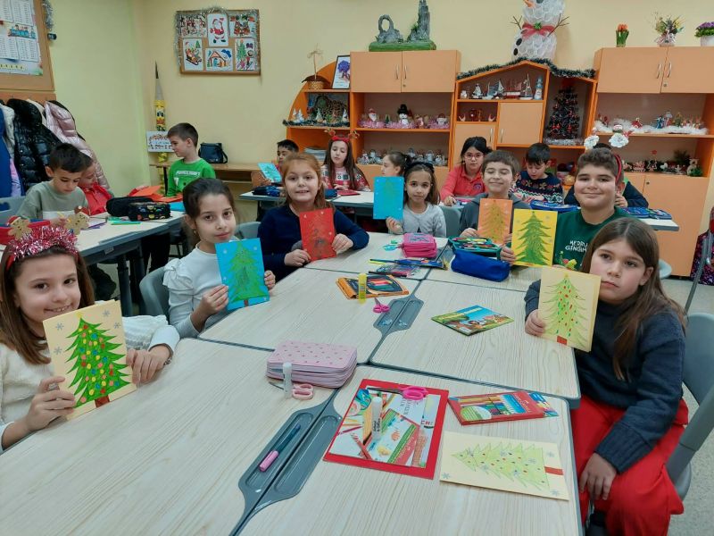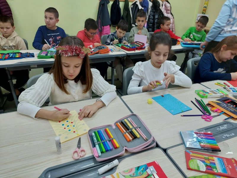 Класните стаи се изпълниха с аромат на Коледа – ножички щракаха, хартия шумолеше, а картичките оживяваха под сръчните ръце на децата. Големите ученици не просто помагаха – те показваха, насърчаваха и вдъхновяваха, а малките работеха с блеснали очи и неподправен ентусиазъм.