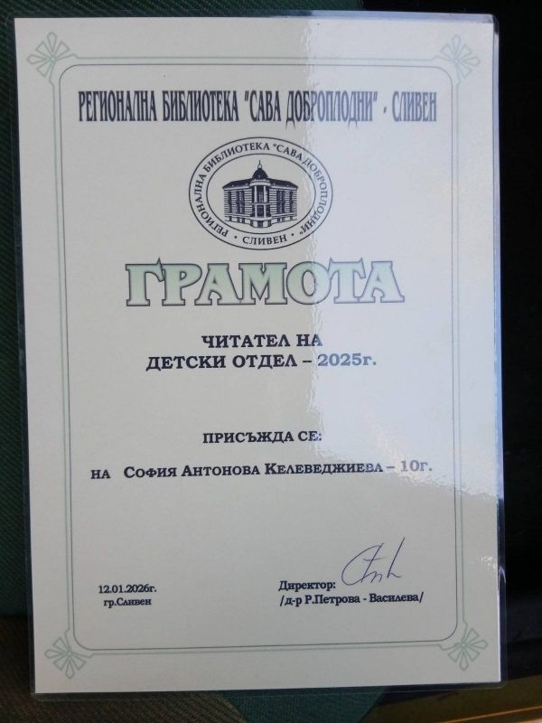 С радост и гордост Ви съобщаваме, че София Келеведжиева, ученичка от 4. „г“ клас, беше отличена с грамота „Читател на детски отдел“ за 2025 година.