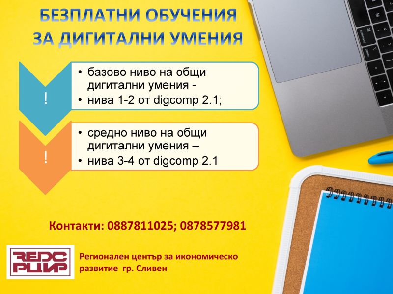 През месец декември 2025 година, РЦИР Сливен завърши две обучения по „Компонент 2: Обучения за DI-GI умения и компетенции“ от Инвестиция C1.I3 - ПЗ „Предоставяне на обучения за дигитални умения и създаване на платформа за обучение на възрастни“ се реализира в рамките на Национален план за възстановяване и устойчивост и се финансира от Европейския съюз посредством „Следващо поколение ЕС“.