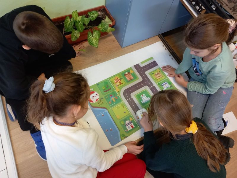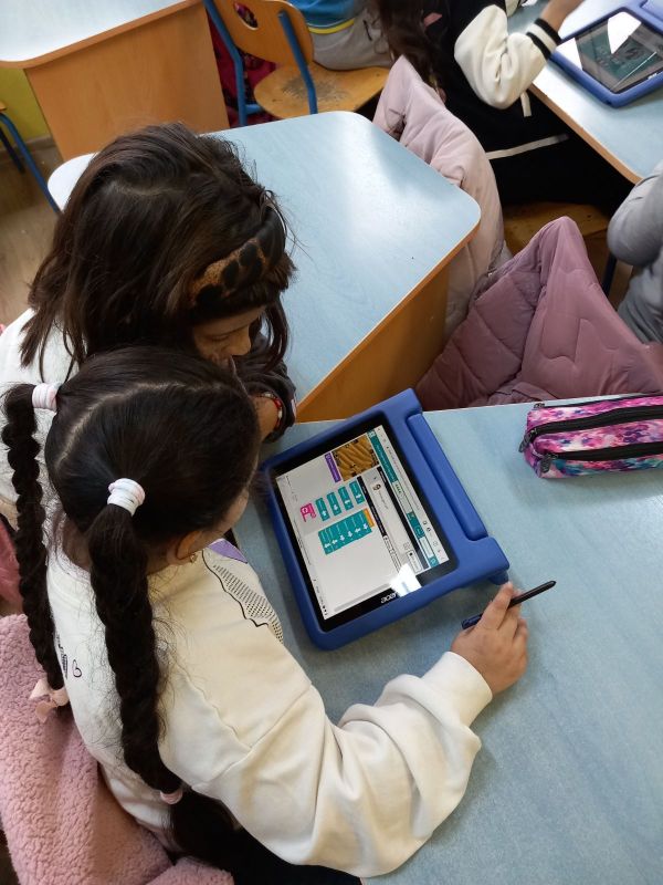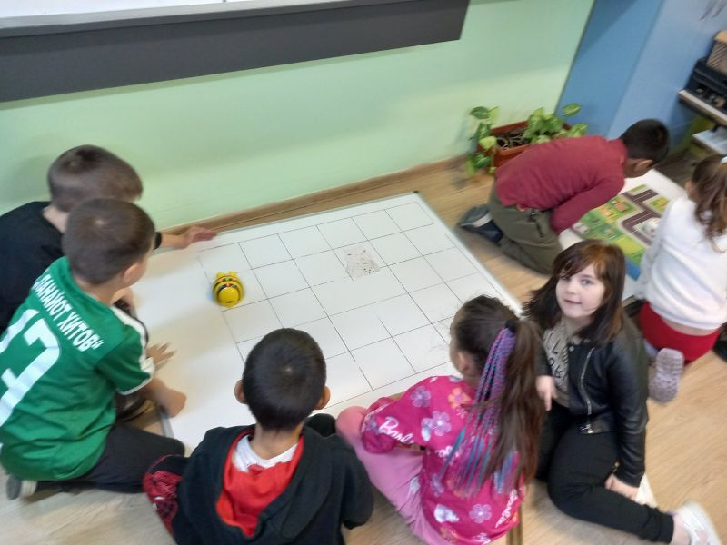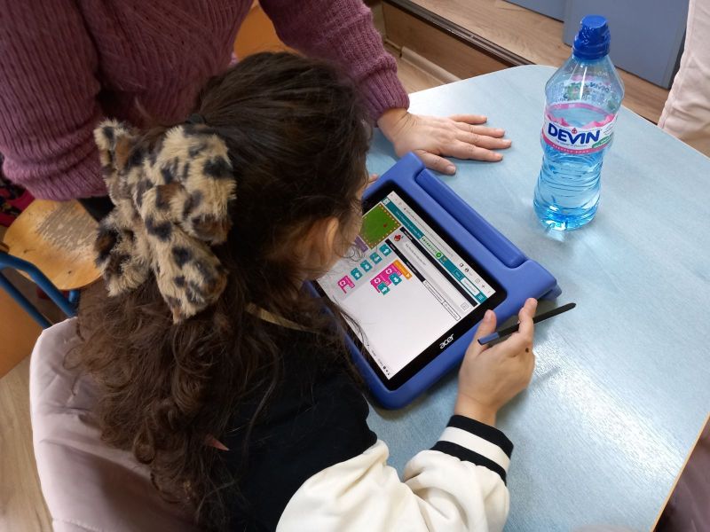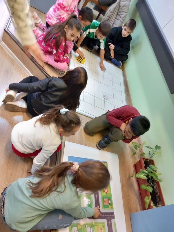 Най-малките ученици усъвършенстват уменията си за пространствена ориентация и логическо мислене с помощта на подови работи. Подреждат блокове и с последователни действия в електронна среда, постигат поставените цели.