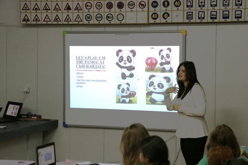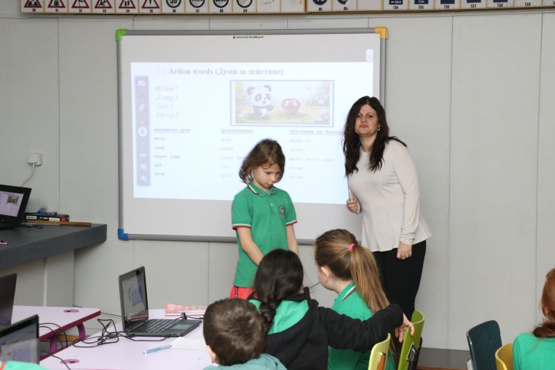 По време на урока учениците се запознаха с основни думи за действие (move, jump, get, drop) и думи за място (near, until), които прилагаха както устно, така и в процеса на програмиране. Използвани бяха интерактивни методи, визуални опори и игрови дейности, които подпомогнаха разбирането и активното участие на всички ученици. Особено мотивираща беше играта „Аз съм пандата“, чрез която децата затвърдиха знанията си, изпълнявайки команди на английски език.