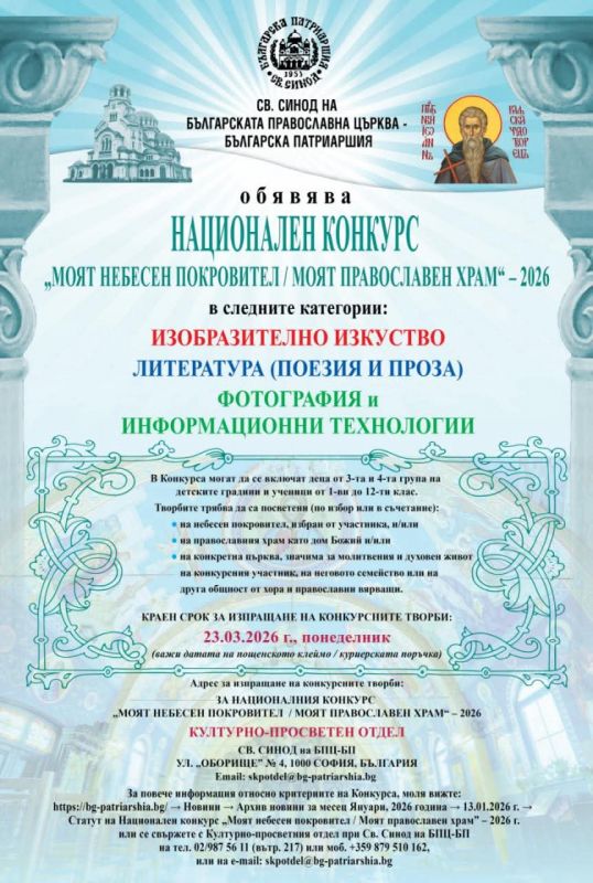 Обява на Национален конкурс „Моят небесен покровител / Моят православен храм“ – 2026 г.