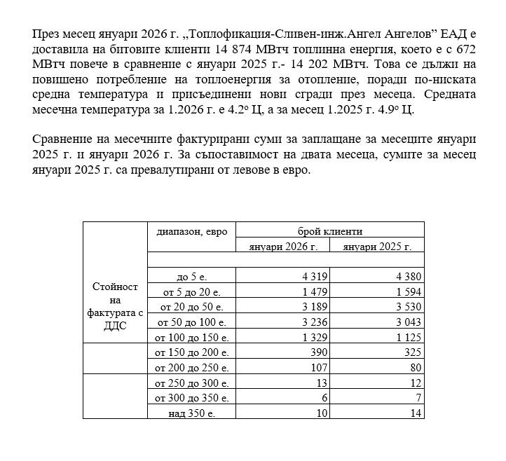 Анализ на потреблението през месец януари 2026 г. на клиенти на „Топлофикация-Сливен-инж. Ангел Ангелов” ЕАД