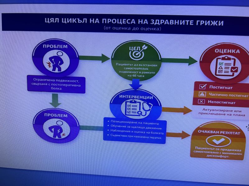 Разгледани бяха и нормативната рамка и професионалната отговорност -стандартът определя задължителните изисквания към практиката и регламентира професионалните дейности на специалистите по здравни грижи, като създава единна рамка за качество и безопасност.