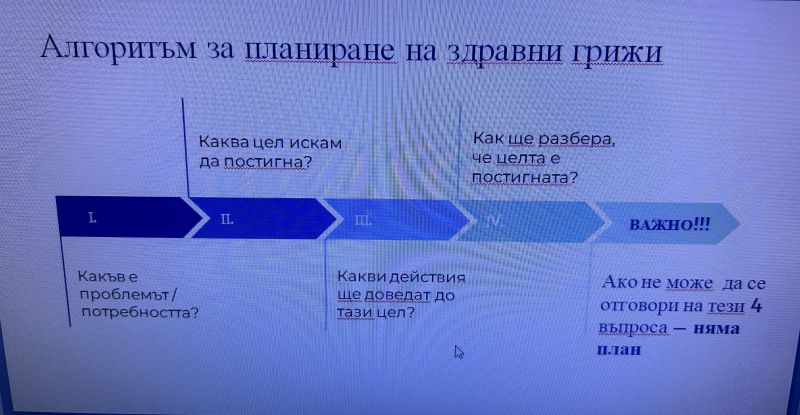 Наблегна се и на оценката на грижите, какво използваме за оценка на грижите и какво следва задължително след оценката. Обучението завърши с дискусия и практическо прилагане на планиране, осъществяване и оценка на здравните грижи.