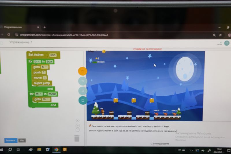 Урокът се превърна в увлекателно образователно приключение, в което съдържанието на двата предмета се преплете по естествен и достъпен за учениците начин. Четвъртокласниците работиха по задача от областта на визуалното програмиране, свързана с управлението на герой – лъвче, което трябваше да изпълнява последователност от команди. Именно тук беше осъществена връзката с българския език: числителните имена – бройни и редни – бяха използвани като ключов инструмент при създаването на програмните стъпки.
