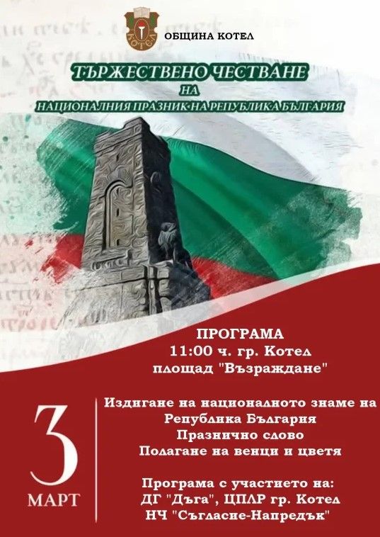 Община Котел има удоволствието да покани гражданите и гостите на града да се включат в тържественото отбелязване на 3 март – 148 години от Освобождението на България.