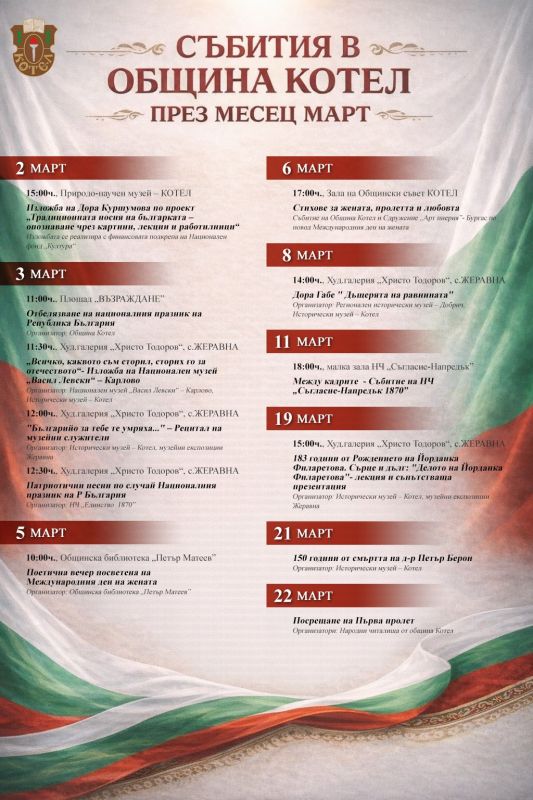 От днес започва културната програма на Община Котел за месец март, която ще предложи на жителите и гостите на града богата поредица от събития. Инициативите са посветени на Националния празник на Република България, Международния ден на жената, значими исторически годишнини и посрещането на Първа пролет.
