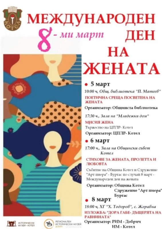 Програмата започва на 5 март от 10:00 часа в Общинска библиотека „Петър Матеев“ с поетична среща, посветена на жената. Същия ден от 17:30 часа в залата на „Младежки дом“ Центърът за подкрепа за личностно развитие – Котел ще представи празничното тържество „Мисия жена“, което ще подчертае значението на жената в обществото чрез музика, слово и артистични изяви.