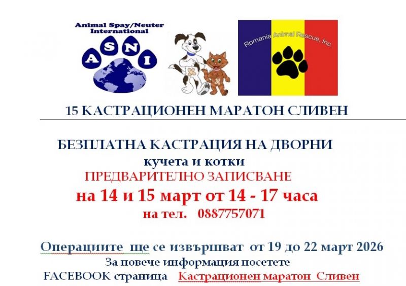 Провеждането на пореден безплатен кастрационен маратон се планира в Сливен. Процедурите ще се състоят в дните от 19 до 22 март и ще обхванат дворни кучета и котки. В него ще се включи екипът на Romania Animal Rescue, Inc Dba Animal Spay Neuter International.