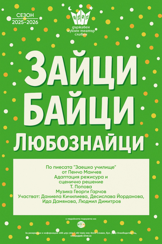 Държавният куклен театър в Сливен кани малките зрители на забавния спектакъл „Зайци Байци – Любознайци“, който ще бъде представен по повод Световния ден на кукления театър. Представлението е част от празничната програма на театъра и ще се играе на 21 март от 11:00 часа, като входът за публиката ще бъде свободен.