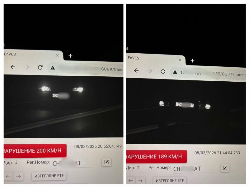 Нарушението е установено през нощта на път І-6 близо до разклона за село Бинкос с камера за контрол на скоростните режими. Сектор „Пътна полиция” в Сливен извършва денонощен контрол на места с повишена концентрация на пътни произшествия и осъществява наблюдение над системните нарушители. На 8 март в 20,55 часа е заснет лек автомобил „БМВ”, който се движи в посока град Казанлък със скорост 200 км.ч. при ограничение 90 км.ч. и в 21,44 часа на същото място автомобилът е засечен в посока Сливен със скорост 189 км.ч.. Водачът е установен. Той е на 21 години от село Чинтулово. За това нарушението са му съставени и връчени два акта на обща стойност 2100 лева, шофьорската книжка му е отнета и автомобилът е спрян от движение. Той има три години стаж зад вола като за този период са му съставени 8 акта и 20 глоби с фиш за различни нарушения на Закона за движение по пътищата. Всички са връчени, 12 от които е заплатил.