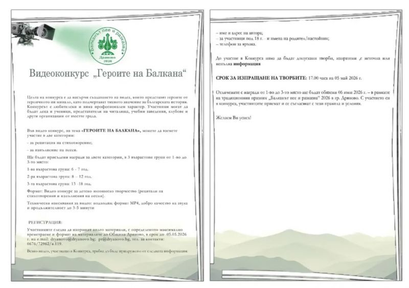 конкурс за кратко видео с изпълнение на стихотворение или авторско видео по темата „Героите на Балкана“;