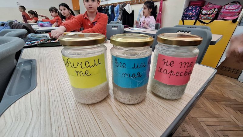 Децата направиха опит с три буркана, пълни с вода и ориз, като върху тях написаха „Обичам те“, „Не те харесвам“ и „Все ми е тая“. В продължение на няколко седмици учениците всеки ден изричаха съответните думи към всеки буркан и наблюдаваха промените.